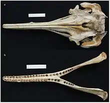 The recognition of I. araguaiaensis as a distinct species is still debated. It was originally distinguished from the Amazon river dolphin (Inia geoffrensis) in January 2014[2][3] on the basis of nuclear microsatellite and mitochondrial DNA data as well as differences in skull morphology (it generally has a wider skull). It also differs from the Amazon and Bolivian river dolphins in the number of teeth per hemimandible (24–28 versus 25–29 and 31–35, respectively).[4]