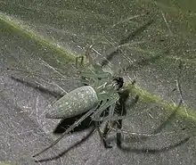 Araneus talipedatus the slender green orb-weaver spider is a species of orb weaver in the family Araneidae. Found in many parts of Australia, this species is active in daytime and builds a conventional orb web. The female has a body length of up to 9 mm, males to 7 mm. Long hairs grow on the legs and pedipalps.[1][2][3]
