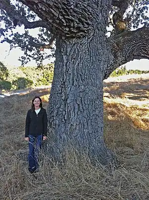 Joan Dudney, former Acterra Steward for Arastradero Preserve, stands by an ancient valley oak (Quercus lobata) just southwest of Arastradero Lake. This tree is over 300 years old and is an acorn granary for acorn woodpeckers (Melanerpes formicivorus).