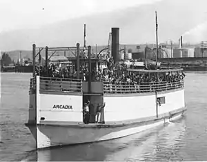 Arcadia was placed on the upper Puget Sound route served by the partnership of Ed Lorenz and Bernt L. Berntson with their steamship Sentinel.[3] This route ran from Tacoma to Henderson Bay.[4] The daily run for Arcadia went from Lakebay, Washington to Tacoma, stopping along the way at Home, Arletta, Anchorage, Warren, Sunnybay, Cromwell, Sylvan, Wollochet, and Cedrona.[2]