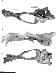 Unlike the modern walrus, Archaeodobenus did not have tusks but instead had canines of moderate size, and looked more like a sea lion.[2] The holotype specimen appears to have been a young adult male of about 3 metres (10 ft) in length, which would have weighed around 473 kg (1,042 lb). This is intermediate between the size of the Steller sea lion and the South American sea lion. Its canines were 86.3 mm (3.4 in) long, compared to modern walrus tusks, which can grow to up to 1 m (3 ft 3 in) long. Archaeodobenus can be distinguished from Pseudotaria by features such as the shape and size of the occipital condyle (which connects with the first neck vertebra at the back of the skull), the foramen magnum (the opening through which the spinal cord passes into the cranium), the mastoid process (where various muscles attach to the back of the skull), and some features in the postcranial skeleton.[1][2][3]