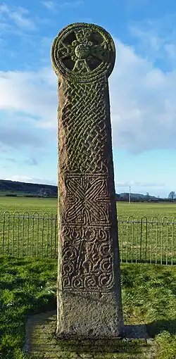 Artefacts from the medieval period also show evidence of Celtic Christianity. Augustine become the bishop of Canterbury in 590 AD, however, St Illtud was already spreading Christianity in Celtic Wales, perhaps very soon after Roman departure in 383 AD.[30] Celtic Christian stone crosses are now held within the 13th century Galilee chapel at St Illtud's church in Llanilltud Fawr (Llantwit Major) and are thought to date from the 8th to 10th centuries.[31] Perhaps the most famous Celtic cross in Wales and the tallest wheel cross in Britain is the Maen Achwyfan (Stone of (Saint) Cwyfan) which most likely dates from the 10th century. This monument contains Celtic- and Norse-influenced carvings of an armed warrior and is considered nationally important in the story of Christianity in Wales.[32][33][34]