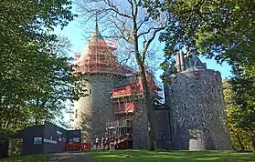 Around Wales, a variety of museums, organisations and charities help promote archaeology to the public. This includes access to many sites, monuments and museums, such as the 121 sites Cadw manages.[63] Public engagement is also encouraged by re-enactment and living history demonstrations and museums, such as Castell Henllys, a reconstructed Iron Age hillfort, and the St Fagans Folklore Museum, which recreates various aspects of Welsh history, with the latter receiving 683,613 visitors in 2018/19.[64] Similar sites include Cosmeston Medieval Village, a 14th-century living history museum. Accessibility is also improved with free online heritage databases, such as Coeflin or Archwilio, run by the Royal Commission on the Ancient and Historical Monuments of Wales and the Welsh Archaeological Trusts respectively.