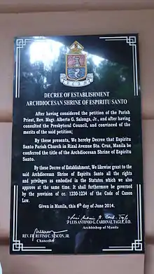 3. "Espiritu Santo Parish Declared Archdiocesan Shrine". The Roman Catholic Archdiocese of Manila. Archived from the original on September 24, 2015. Retrieved April 4, 2015.