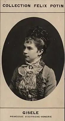 The Archduchess was born on 12 July 1856, the second child of Franz Joseph I of Austria and Elisabeth in Bavaria. She was named Gisella Louise Marie, which the name Gisella was named after Queen Gisela of Hungary, wife of Stephen I, first Christian Hungarian king.[1] Although christened Gisella, she only ever wrote her name with one L. Just like her elder sister Archduchess Sophie and her brother Crown Prince Rudolf, Gisela was raised by her paternal grandmother, Archduchess Sophie of Austria. Of a sober nature like her father, she kept a reserved attitude towards her mother. She had a very close relationship with her brother, whose suicide affected her greatly.