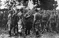 Meanwhile, the Russian Empire fell apart, and there appeared the Ukrainian People's Republic. Following the Treaty of Brest-Litovsk, Austria-Hungary and the German Empire started to help Ukraine militarily in its struggle against Bolsheviks.[1] Promoted to the rank of captain, Vasyl Vyshyvanyi was placed in charge of the "Battle Group Archduke Wilhelm", created by the Emperor Charles I, and provided with approximately 4,000 Ukrainian soldiers and officers under his command from the Austrian Legion of Sich Riflemen[1] and was directed to the Ukrainian South where they fought Bolsheviks.[1] At first the Austrian forces entered the already liberated Kherson and later for two months left in Aleksandrovsk (today Zaporizhzhia) where the Archduke began a series of turbulent missions: building connections between the Galician riflemen and local population, cooperating with the local public organization of Prosvita, and attempting to lift military spirit, visiting iconic sites of Cossack history along with his subordinates.[1] His troops occupied a small area near the site of the old Zaporozhian Sich, and were tasked with supporting the Ukrainian national cause in any way possible. This was done by screening officials by ethnicity, creating a newspaper, and engaging in cultural work with local peasants. Wilhelm mixed easily with the local peasants, who admired his ability to live simply like his soldiers. Within Wilhelm's personal occupation zone, peasants were allowed to keep the lands that they had taken from the landlords in 1917, and Wilhelm prevented the Habsburg armed forces from requisitioning grain. Ukrainians who had resisted requisitioning elsewhere - including those who had killed German or Austrian soldiers - were given refuge within Wilhelm's territory. During time the warriors of Vasyl Vyshyvanyi came in close cooperation with warriors, called Skhidniaky (for "Easterners"), particularly members of Zaporizhzhia Corps of the Ukrainian Army.[1] These actions outraged Germany and Austrian officials in Kyiv, but increased his popularity among local Ukrainians, who referred to him as affectionately as "Kniaz Vasyl" (local correspondence to Archduke Wilhelm).
