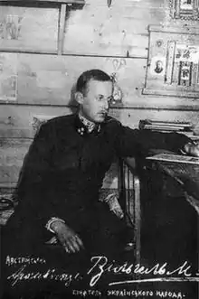 In June 1919, while traveling across Carpathians, Wilhelm was arrested by Romanian soldiers and detained for three months until on petition of the Ukrainian People's Republic he was released.[1] He then left for Kamianets-Podilskyi, which served as a capital of Ukraine.[1] After pledging loyalty to the Ukrainian People's Republic, he was made a colonel and headed a section of international relations of the General Staff Main Department within the Ukrainian People's Army.[1] In protest at Petliura's peace treaty with Poland in 1920, which he considered to be a betrayal, he resigned and lived in exile in Vienna.[1]