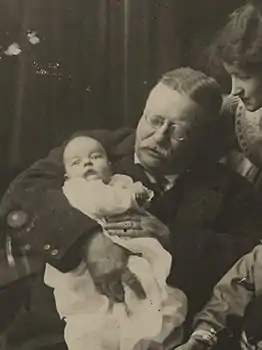 Archibald Bulloch Roosevelt, Jr. held by Theodore Roosevelt and the baby's mother Grace Stackpole Lockwood Roosevelt (right) at Sagamore Hill in 1918