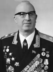 Archil Viktorovich Gelovani (Georgian: არჩილ გელოვანი, Russian: Арчил Викторович Геловани; 27 November [O.S. 14 November] 1915 – 19 August 1978) was a Soviet officer and later Marshal of the engineer troops, responsible for logistics, fortification and military infrastructure during and after World War II. He was tasked on several occasions with fortifying strategically important areas and also reconstruction, including all Black Sea ports during and after World War II. He served primarily on military engineering and defense strategy posts, including being the Deputy Minister of Defence and would play a major role in the structural development of the Soviet armed forces and strategic missile forces during the Cold War era. An avenue in Georgia's capital Tbilisi and a street in the city of Sevastopol have been named after Marshal Gelovani.[1]