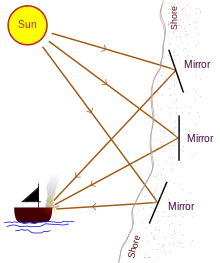 Often called the "Archimedes heat ray", the purported mirror arrangement focused sunlight onto approaching ships, presumably causing them to catch fire. In the modern era, similar devices have been constructed and may be referred to as a heliostat or solar furnace.[51]