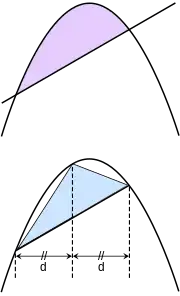 If the first term in this series is the area of the triangle, then the second is the sum of the areas of two triangles whose bases are the two smaller secant lines, and whose third vertex is where the line that is parallel to the parabola's axis and that passes through the midpoint of the base intersects the parabola, and so on. This proof uses a variation of the series 1/4 + 1/16 + 1/64 + 1/256 + · · · which sums to 1/3.