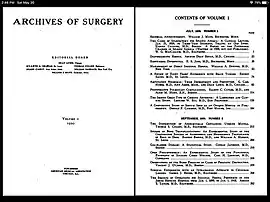 In July 1920, the first issue of Archives of Surgery was published by the American Medical Association. William J. Mayo, MD, who was a member of the editorial board and authored the inaugural editorial, indicated that Archives of Surgery would follow the character and scope of its sister journals, Archives of Internal Medicine, Archives of Neurology and Psychiatry, and the American Journal of Diseases of Children.[1] Mayo also commented that Archives of Surgery would not compete with the other two prominent surgical journals that existed at the time: Annals of Surgery, established in 1885, and Surgery, Gynecology and Obstetrics, established in 1905. The trustees who founded Archives of Surgery believed that creating this new surgical journal would help alleviate the publication burden of the other two surgical journals while also creating a "sphere of its own" that would be "sufficiently useful to the profession to warrant its entering the field".[1]