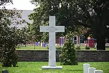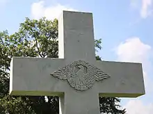 The Argonne Cross Memorial is located in Section 18 of Arlington National cemetery near the western wall.[16] The memorial consists of a 13-foot (4.0 m) tall[17][18] Latin cross of white marble[12] from Vermont.[19] The image of an eagle with outspread wings, clutching and appearing in the middle of a wreath, was carved where the arms of the cross met.[11] The cross stands on a rectangular marble base about 6 inches (15 cm) high. On the front of this base is carved the original inscription:[20][21]