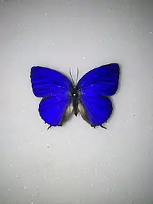 Like Arhopala araxes a Celebes-form, from Macassar; size of araxes or still larger, but the upper surface of the is uniformly blue; beneath the markings are also in the forewing intensely surrounded with yellowish-white.[2]