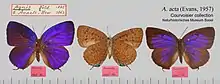 Arhopala acta is a species of butterfly belonging to the lycaenid family described by William Harry Evans in 1957. It is found in Southeast Asia (Sumatra and Peninsular Malaya).