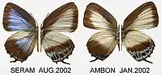 The female is above blue with a broad blackish-brown margin of the wings, in the hindwing along the posterior part of the border with a series of white-blue spots. Beneath blackish-brown with a broad, joint, whitish band, hindwing with a broad, greenish-blue, black-spotted marginal band.[2]