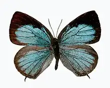 Arhopala tomokoae is a butterfly of the family Lycaenidae. Panchala paraganesa tomokoae H. Hayashi, 1976 was moved to Arhopala paraganesa tomokoae by Schröder and Treadaway in 1955 and its status changed to Arhopala tomokoae by Schrőder and Treadaway in 2002.