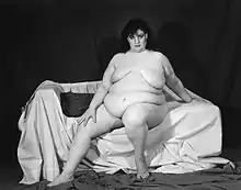 In 1999, she exhibited for the first time in Paris her Aviva series at the Galerie Frank. This series was crucial in Lopez-Huici's search for the transgressive body. Aviva, a beautiful large woman reclined or sat proudly on a bed. Arthur Danto wrote in the exhibition catalogue that "the paraphernalia underscores Aviva's identity as a model, someone who is there to be depicted, and not to represent anything ulterior. The poses too belong to the repertory of studio poses : she is not shown doing anything but pose, which of course goes with her nudity" and further "The photographistic setting is intended as a guarantor of the reality the photographs show : Aviva is the way we see her."[5]