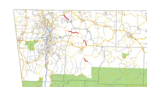 Highway 127 was first designated between 1927 and September 1, 1928, by renumbering State Road 19 between Old Alabam and Forum.[1][2] A second segment of Highway 127 was created from Highway 12 to Beaver Lake on August 25, 1965.[6] The highway was rerouted on June 7, 1995, at the request of the Benton county judge to connect to Highway 12 on both ends, and the former alignment was turned back to county maintenance.[7] The segment of Highway 127 between Garfield and Lost Bridge Village was created on November 23, 1966.[8] The Aurora segment was created on June 28, 1973, pursuant to Act 9 of 1973 by the Arkansas General Assembly.[9] The act directed county judges and legislators to designate up to 12 miles (19 km) of county roads as state highways in each county.[10]