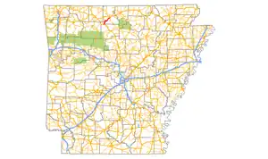 The route begins at U.S. Route 65 near Pindall and runs northeast into Marion County. The highway serves Verona and has a junction with Highway 125 before entering Bruno.[3] Highway 235 has a spur route in Bruno which runs south through the unincorporated community. The route continues northeast to Arkansas Highway 14 in Yellville, where the route terminates.