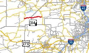 Arkansas Highway 314 (AR 314 and Hwy. 314) is an east–west state highway in Perry and Yell Counties. The route runs 17.45 miles (28.08 km) as a connector between Arkansas Highway 27 and Arkansas Highway 7 in the Ouachita National Forest.[3][4] The route does not intersect any other state highways.