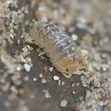 Armadillidium album, also known as the beach pill woodlouse, is a species of isopod within the family Armadillidiidae.[1] The species is salt tolerant,[2] inhabiting coastal sand dunes and saltmarshes within Europe. They can sometimes be found under driftwood or burrowed within grains of sand of which their colour pattern mimics.[3]