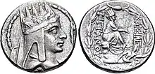 In scholarship, the term Armenian tiara is used to refer to a spikey tiara that was characteristic of the coinage of Armenia during the Late Hellenistic period.[1] It originated from the insignia used by the royal and satrapal authority in the Achaemenid Empire.[2] The best known example was the one worn by the Artaxiad king of Armenia, Tigranes the Great (r. 95–55 BC).[1]