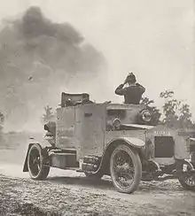 Another early armored car of the period was the French Charron, Girardot et Voigt 1902, presented at the Salon de l'Automobile et du cycle in Brussels, on 8 March 1902.[12] The vehicle was equipped with a Hotchkiss machine gun, and with 7 mm (0.28 in) armour for the gunner.[13][14]