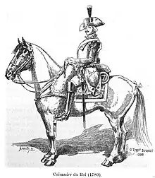 In the 18th century, the only troop type to wear body armour was the cuirassier, named after their cuirass.[2] Described as "big men on big horses" whose main task was to defeat the enemy cavalry, they were the closest thing to the heavily armoured knights of old.[3] Usually painted black, their cuirass was rather uncomfortable to wear and quite heavy, as it was expected to withstand a musket shot before being accepted to service.[2] Head protection was neglected throughout much of the 18th century. After the lobster-tailed helmets had been abandoned by most European armies by the second half of the 17th century, there were no proper helmets that replaced them. Instead of helmets, both infantry and cavalry resorted to hats made of linen or cloth and fur caps. If at all, simple iron skull caps were worn under these hats.[4] Alternatively, the hats might be reinforced by an iron framework. An 18th-century commander known to have worn a skull cap was August the Strong, whose specimen weighted almost 10 kilogram.[5] In any case, they offered no protection against bullets and were only meant to protect the wearer from sword cuts. Hence, they were primarily restricted to cavalry.[4] Dragoons, mounted infantry, also often wore iron skull caps, although their battlefield purpose had become indistinguishable from that of other cavalry by around 1750.[6]