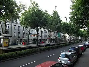 Arnulfstraße is a station on the Cologne Stadtbahn line 18, located in the Cologne district of Lindenthal. The station lies on Luxemburger Straße, adjacent to nearby Arnulfstraße, after which the station is named. Right next to it is the Weißhaus, after which Weißhausstraße and Weißhausstraße station are named. Due to its proximity to three Gymnasien (high schools), Schillergymnasium, Hildegard of Bingen Gymnasium and Elisabeth of Thuringia Gymnasium, it is often used by students.
