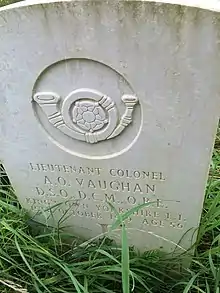 He and Katherine had four children. Katherine died in 1927, while Vaughan died in 1919. A fund was raised to provide a memorial for his grave in honour of his Welsh patriotism in St Thomas' Church, Rhyl, Flintshire. Two headstones mark his grave: an Imperial War Graves Commission headstone under the name, Lt Col A. O. Vaughan,[7] with the badge of the King's Own Yorkshire Light Infantry and a Celtic cross honouring his achievements for the Welsh[2] under his bardic name Owen Roscomyl.[2]