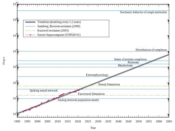 The third objective is generally called artificial general intelligence by researchers.[3] However, Ray Kurzweil prefers the term "strong AI". In his book The Singularity is Near, he focuses on whole brain emulation using conventional computing machines as an approach to implementing artificial brains, and claims (on grounds of computer power continuing an exponential growth trend) that this could be done by 2025. Henry Markram, director of the Blue Brain project (which is attempting brain emulation), made a similar claim (2020) at the Oxford TED conference in 2009.[1]