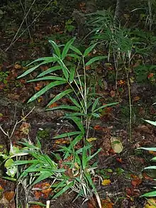 Arundinaria appalachiana, commonly known as hill cane, is a woody bamboo native to the Appalachian Mountains in the southeastern United States. The plant was elevated to the species level in 2006 based on new morphological and genetic information and was previously treated as a variety of Arundinaria tecta. The shortest member of its genus, hill cane ranges from 0.4โ€“1.8 meter tall with a habit ranging from diffuse to pluri-caespitose.[2] It is one of only three temperate species of bamboo native to North America. Hill cane is common on dry to mesic sites on upland slopes, bluffs and ridges in oak-hickory forests, which distinguishes it from other species in the genus: Arundinaria gigantea typically appears along perennial streams, while Arundinaria tecta is found in swamps and other very wet areas.
