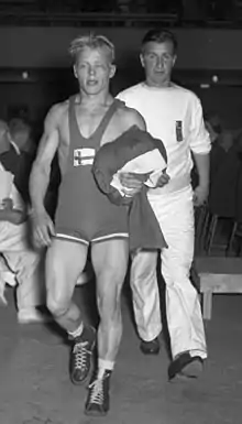![]() Kyllönen with coach at the 1952 Olympics | |