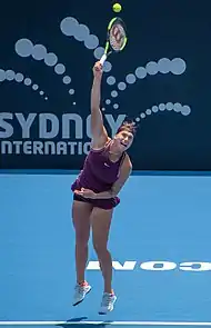 After playing relatively few WTA events in 2017, Sabalenka utilized her higher ranking to play exclusively on the WTA Tour in 2018.[26] She reached two quarterfinals to begin the year,[27][28] but lost her opening-round match at the Australian Open to top-ranked Australian and world No. 18 Ashleigh Barty.[29] She then won her first matches at a Premier tournament with a third-round appearance at the Indian Wells Open before the early-year hardcourt season came to a close, including a victory over No. 19, Svetlana Kuznetsova.[30][26]