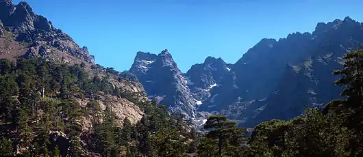 Asco offers a range of extremely rich and varied landscapes of bare rocky mountains in the Gorges of Asco, almost impenetrable scrub above the gorges, and dry and arid with a forest of prickly juniper in the vicinity of the village with thick forests of black pine above the village. Below the ridge lines thick and aromatic Alder bushes grow[6] called u bassu in Corsican: an endemic shrub without a trunk. The remarkable Asco communal forest that covers the upper valley includes the Forest of Vecchietto and the Forest of Carrozzica, which are larger and higher, but both on the Asco slopes. These landscapes are similar to high alpine valleys. The presence of a ski resort (now closed) only reinforces the illusion.