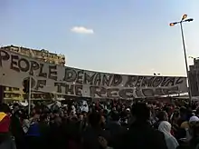 Ash-shaʻb yurīd isqāṭ an-niẓām (Arabic: الشعب يريد إسقاط النظام, lit.'the people want to bring down the regime', pronounced [æʃˈʃaʕb juˈriːd ʔɪsˈqɑːtˤ ænniˈðˤɑːm]) is a political slogan associated with the Arab Spring.[1][2] The slogan first emerged during the Tunisian Revolution.[3] The chant echoed at Avenue Habib Bourguiba in Tunis for weeks.[2] The slogan also became used frequently during the 2011 Egyptian revolution.[4][5][6][7] It was the most frequent slogan, both in graffiti and in chants in rallies, during the revolution in Egypt.[8]