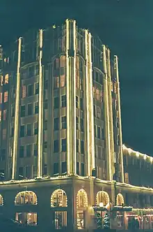 The Ashland Springs Hotel is a member of Historic Hotels of America, the official program of the National Trust for Historic Preservation.[3] The hotel was built before the Great Depression, originally as the Litha Springs Hotel.[4] It was built as a first-class hotel to draw visitors to the area, designed by the architectural firm Tourtellotte & Hummel with reinforced concrete with architectural elements that reflected a Romanesque, Gothic, and Neo-Classical Revival style.[4] It was planned to be the tallest building between Portland and San Francisco. The design of the hotel was similar to that of the Boise Hotel and the Baker Hotel, featuring a nine-story central tower with two short wings.[4]
