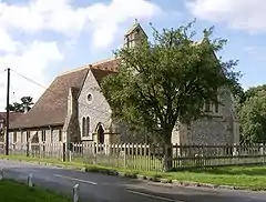 The Church is built of local knapped black flints with Bath stone dressings. There is a bellcote with two bells. There is a boiler house, and the church was originally being heated by "Hayden's hot air apparatus", now disused. The porch is on the Northern side of the building the front of which is an oak moulded archway, the timber being framed in red bricks - herringboned. The roof is of plain clay tiles. St. John's has stained glass windows from various makers including Burlison and Grylls, Kempe and Co., James Powell and Sons, C.E. Moore and A.L. Moore.[3]