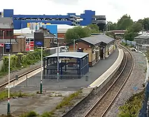 ![]() The station's island platform, looking towards Manchester. | |
