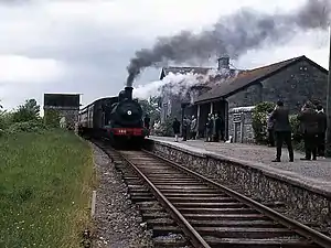 The station building and platform still stand next to the mothballed railway, with some of the station structures in use as a private house since the line was closed in 2003.[4] The station house is a protected structure.[1][5]