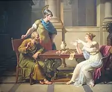 In the nineteenth century, Plutarch's narrative dominated the interpretation of Aspasia in both novels and paintings.[72] In the visual arts, the sexualised side of Aspasia was represented by Jean-Léon Gérôme's painting Socrates Seeking Alcibiades in the House of Aspasia, but this pornographised representation was relatively uncommon.[73] Honoré Daumier's lithograph of Socrates at the House of Aspasia depicts Aspasia as a "lorette", an ambiguous social position which referred to "loose, vulgar or 'liberated' women".[74] Other artists of the period depicted an Aspasia active in public life, and interacting with the most renowned men of the period. In Henry Holiday's painting of Aspasia on the Pnyx, she is shown with another woman at the site of the Athenian assembly, the center of male public space in the city,[75] while in two paintings by Nicolas-André Monsiau she is shown at the centre of discussions with celebrated Athenian intellectuals and politicians.[76] In Socrates and Aspasia, she converses with Socrates and Pericles; in Aspasia in Conversation with the Most Illustrious Men of Athens, Euripides, Sophocles, Plato, and Xenophon are also among those included.[77] In both of these paintings, Aspasia is speaking and commanding the attention of these men.[78] Melissa Ianetta argues that Germaine de Staël's novel Corinne models its heroine after Aspasia, placing her in the same tradition of feminine rhetorical skill.[79]