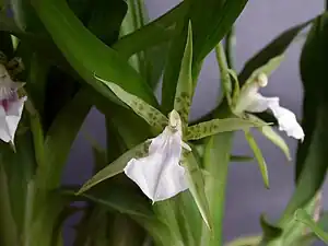 Aspasia is a genus of comparatively robust plants intermediate of Brassia and Miltonia, to which it is morphologically closer although can be distinguished because its flowers show the labellum partially fused to the column up to the middle then abruptly folded down in a square angle.[5] They are characterized for often showing am elongated rhizome, with thicker roots than Miltonia, with more elliptical or elongated and highly laterally flattened pseudobulbs, protected by some foliar sheaths shorter than the leaves, and one or two apical leaves. These are articulated, basally conduplicate, ligulate sometimes with acute apex, thin and narrow, very malleable, light green colored. The inflorescence is erect or arching, shorter than the leaves and bares one to nine flowers sometimes showy, which open in quick sequence holding at least three of four opened at the same time.[2] The inflorescence shoots among the foliar sheaths on the pseudobulbs bases.