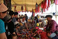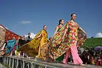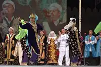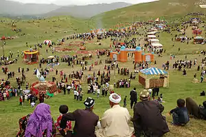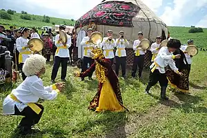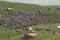 This year's highlight was an exhibition of Akhal-Teke horses, whose beauty, grace and skills had been charming people around the world for 5,000 years.[15] Scores of motley yurts, pavilions, and cafes offering national culinary delights were mounted at the foot of the Tuproq Qala citadel while young lads dressed like warriors were standing as historical guards on top of the old walls of the fortress along its perimeter.[16]