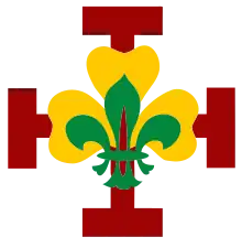 The emblem of the Association des Scouts et Guides du Congo incorporates the color scheme of the flag of the Republic of the Congo.