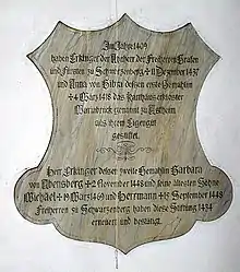 The charterhouse was founded on June 2, 1409, by Erkinger von Seinsheim[2] and his first wife, Anna von Bibra, as a place of burial for their family, a function which the monastery served for several centuries for Erkinger's descendants, the Barons and later Princes von Schwarzenberg. Erkinger, his second wife Barbara von Abensberg, and Anna's sons Michael and Hermann renewed and confirmed the charterhouse in 1434.