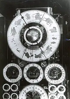 The Astrarium of Giovanni Dondi dell'Orologio was a complex astronomical clock built between 1348 and 1364 in Padova, Italy, by the doctor and clock-maker Giovanni Dondi dell'Orologio. The Astrarium had seven faces and 107 moving gears; it showed the positions of the sun, the moon and the five planets then known, as well as religious feast days. The astrarium stood about 1 metre high, and consisted of a seven-sided brass or iron framework resting on 7 decorative paw-shaped feet. The lower section provided a 24-hour dial and a large calendar drum, showing the fixed feasts of the church, the movable feasts, and the position in the zodiac of the moon's ascending node. The upper section contained 7 dials, each about 30 cm in diameter, showing the positional data for the Primum Mobile, Venus, Mercury, the moon, Saturn, Jupiter, and Mars. Directly above the 24-hour dial is the dial of the Primum Mobile, so called because it reproduces the diurnal motion of the stars and the annual motion of the sun against the background of stars. Each of the 'planetary' dials used complex clockwork to produce reasonably accurate models of the planets' motion. These agreed reasonably well both with Ptolemaic theory and with observations. For example, Dondi's dial for Mercury uses a number of intermediate wheels, including: a wheel with 146 teeth, and a wheel with 63 internal (facing inwards) teeth that meshed with a 20 tooth pinion.