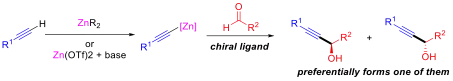 The asymmetric addition of alkynylzinc compounds to aldehydes is an example of a Nef synthesis, a chemical reaction whereby a chiral propargyl alcohol is prepared from a terminal alkyne and an aldehyde. This alkynylation reaction is enantioselective and involves an alkynylzinc reagent[1] rather than the sodium acetylide used by John Ulric Nef in his 1899 report of the synthetic approach.[2][3] Propargyl alcohols are versatile precursors for the chirally-selective synthesis of natural products and pharmaceutical agents, making this asymmetric addition reaction of alkynylzinc compounds useful. For example, Erick Carreira used this approach in a total synthesis of the marine natural product leucascandrolide A,[4] a bioactive metabolite of the calcareous sponge Leucascandra caveolata with cytotoxic and antifungal properties isolated in 1996[5][6] (an earlier partial synthesis was reported by Crimmins[7] and a total synthesis was reported by James Leighton[6]).