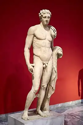 Hermes/the youth stands in contrapposto, supporting most of his weight on his left foot, while his right leg is relaxed.[1][2] He bears a chlamys draped over his left shoulder and wound over his arm, then falling on his back and hanging on the tree-trunk support, so that Hermes is mostly naked.[1][2] Hermes's left arm is bent at the elbow, while his right one hangs freely at his side.[1] He would have held objects in both hands, neither of which survive; his left hand probably held a caduceus, Hermes's most recognisable symbol, while his right a pouch.[1]