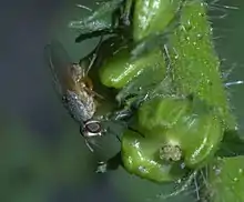 This small fly has an angular head, transparent wings, and the adult fly is colored between gray and yellow.[1] Males have a rounded abdomen and are smaller than females. The abdomen in the females is larger and pointed. The larvae is cylindrical, white and has mouthhooks that are used to masticate the tender parts of the new shoots.[3]